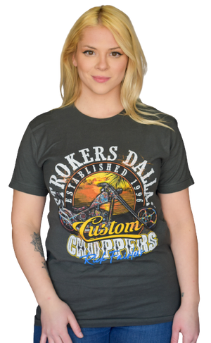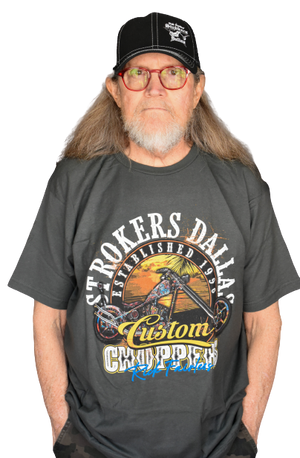 Elevate your wardrobe with this custom Strokers Dallas charcoal T-Shirt featuring the iconic Rock n Roll (Betty) Chopper logo on the front and a patriotic Strokers red, white, and blue logo on the back. Make a bold statement and exude rock n roll vibes wherever you go!