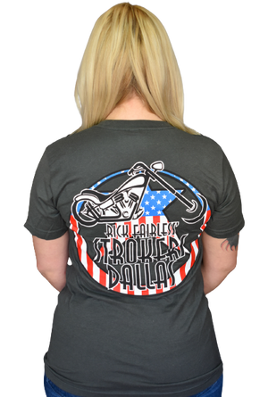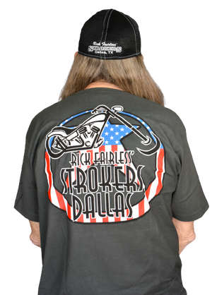 Elevate your wardrobe with this custom Strokers Dallas charcoal T-Shirt featuring the iconic Rock n Roll (Betty) Chopper logo on the front and a patriotic Strokers red, white, and blue logo...