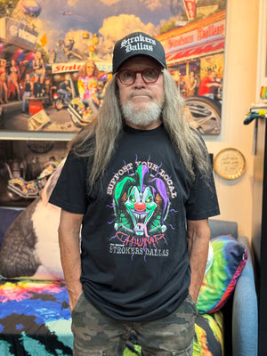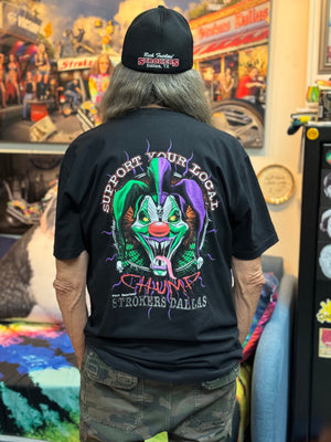4.3 oz./yd², 100% combed ring-spun cotton 90/10 cotton/polyester Fabric laundered Set-in 1x1 baby rib collar Hemmed sleeves Side seams Privately labeled for Strokers Dallas