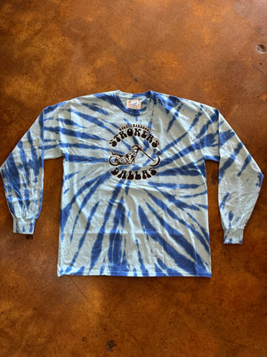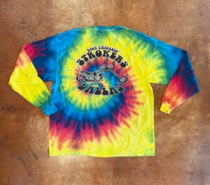 Limited run Strokers Tie Dye long sleeve tee featuring the Groovy logo in white on the front of the tee and in black on back of the tee. Perfect for fall, get 'em while they last!