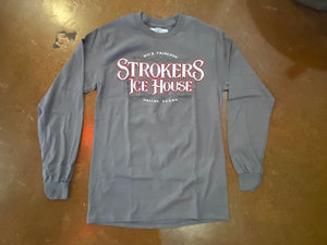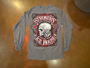 This classic long sleeve grey t-shirt features a *NEW* Strokers Icehouse skull design with red accents and a Strokers Icehouse logo across the chest
