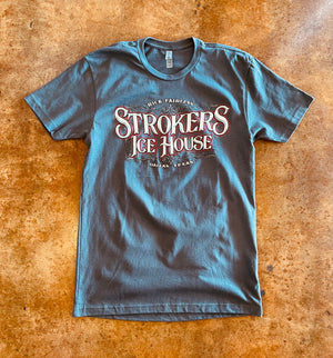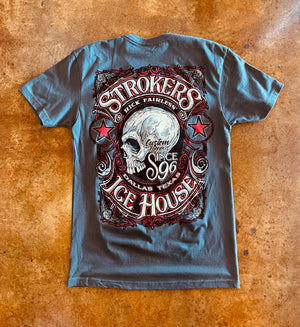 This classic grey t-shirt features a *NEW* Strokers Icehouse skull design with red accents and a Strokers Icehouse logo across the chest