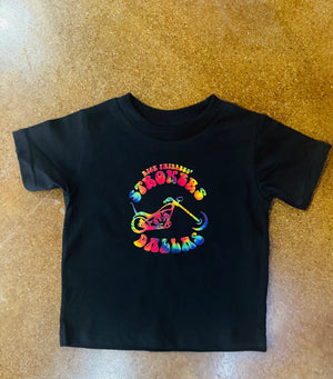 Lil’ Rider Tee – Kid’s Strokers Dallas Shirt Get your little one geared up in biker style with our Lil’ Rider Tee! This soft black shirt features a vibrant, rainbow chopper...