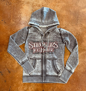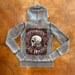 This limited run grey burnout hoodie features a large back print Strokers Icehouse logo with Strokers Icehouse print along the front chest