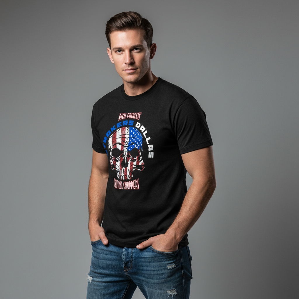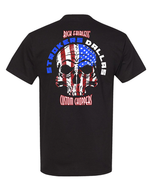 4.3 oz./yd², 100% combed ring-spun cotton 90/10 cotton/polyester Fabric laundered Set-in 1x1 baby rib collar Hemmed sleeves Side seams Privately labeled for Strokers Dallas