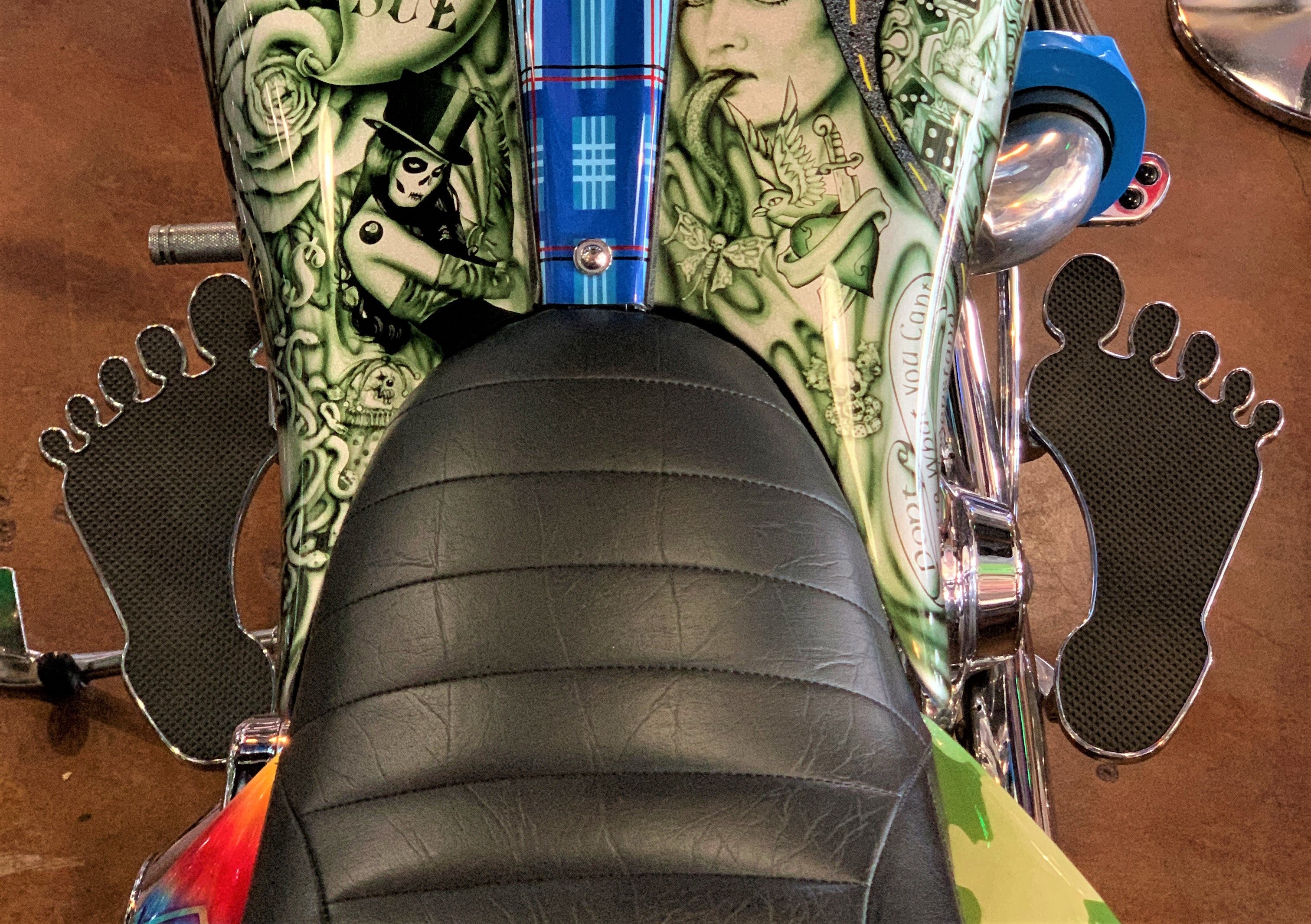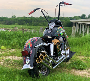 Get that old school cool look with custom Footboards from Rick Fairless. Super cool and groovy throwback look! Available for Harley Davidson in Chrome or Black.