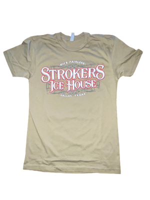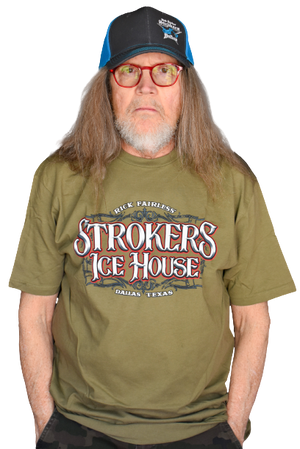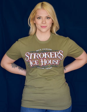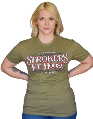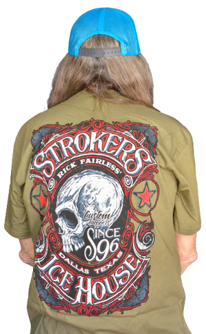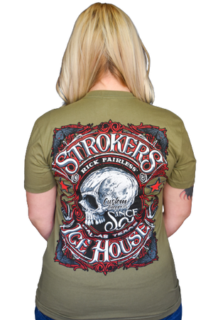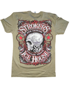 This classic military green t-shirt feature a *NEW* Strokers Icehouse skull design with red accents and a Strokers Icehouse logo across the chest