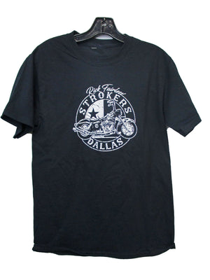 This custom Strokers Dallas Short Sleeve Tee Shirt features custom graphics on the front and back of the shirt. Strokers is famous for choppers and t-shirts and this one is another cool shirt from Rick Fairless himself!