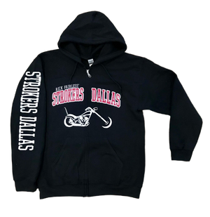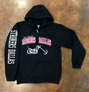 Soft, fleece, heavy weight, zip hoodie with unique lettering and a custom motorcycle logo front and center. Strokers Dallas lettering is also featured on right hand sleeve.