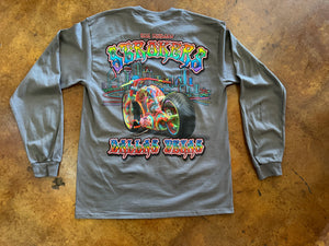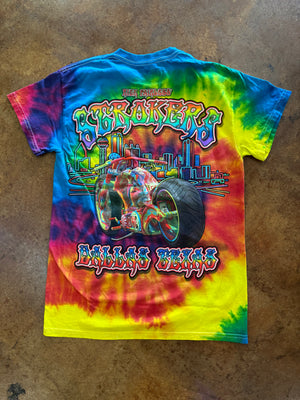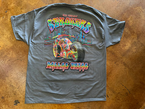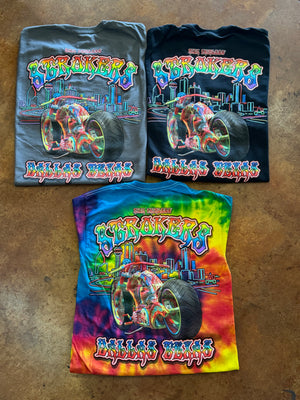 Another Strokers Dallas original shirt, straight from the mind of Rick Fairless himself. This shirt features his famous "Pam" Chopper, with the Dallas skyline in the background on the back and a Tie Dye "Strokers Dallas" script on the front. Show your support, and get yours today!