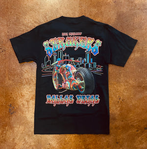 Another Strokers Dallas original shirt, straight from the mind of Rick Fairless himself. This shirt features his famous "Pam" Chopper, with the Dallas skyline in the background on the back and...